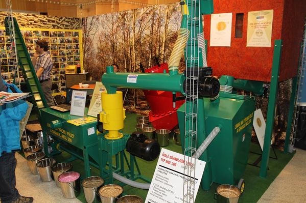 Společnost Kovo Novák zde ukázala linku na malovýrobu pelet. Zařízení se skládá ze zásobníku, vlhčícího promíchávače, peletovacího lisu a třídičky. Linka je schopna vyrobit cca 50 – 150 kg pelet za hodinu v závislosti na jejich velikosti a typu suroviny. Příkon celé soustavy činí 8,85 – 10,85 kW. Pokud byste chtěli doma vyrábět pelety z biomasy a zásobovat nejbližší okolí, počítejte s cenou cca 240 000 Kč za výrobní linku plus další náklady na šrotovník, případně drtič.