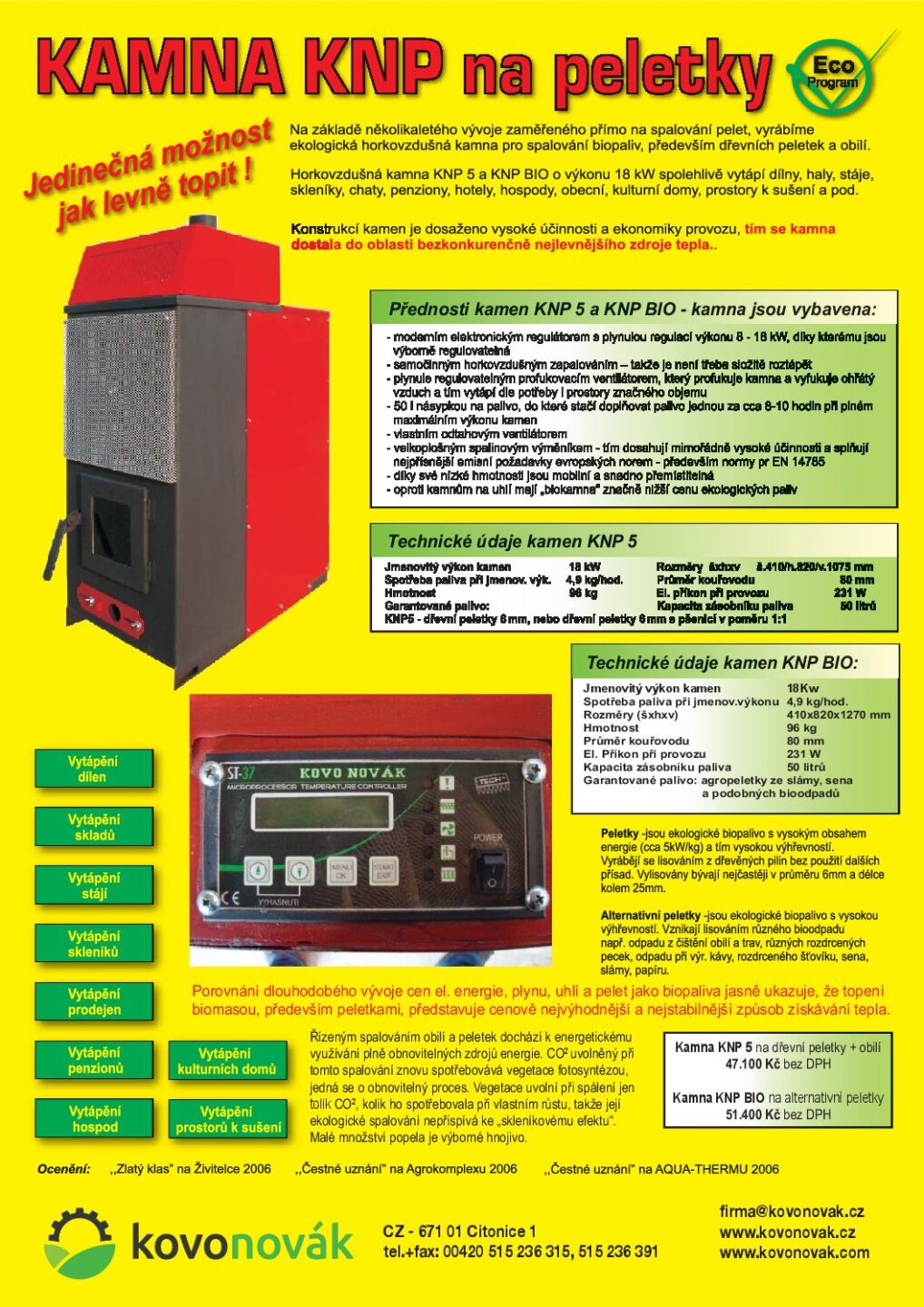 Kamna KNP – Na základě několikaletého vývoje zaměřeného přímo na spalování obilí, vyrábíme ekologická horkovzdušná kamna pro spalování biopaliv, především obilí a peletek. Horkovzdušná kamna KNP o výkonu 18 kW spolehlivě vytápí stáje, dílny, skleníky, haly, kanceláře, prostory k sušení, části domů, chaty, penziony, hotely, hospody, obecní, kulturní domy a pod. Konstrukcí kamen, především zohledněním spalování zrní v konstrukci hořáku a topeniště, je dosaženo vysoké účinnosti a ekonomiky provozu. Tím se kamna dostala do oblasti bezkonkurenčně nejlevnějšího zdroje tepla. Díky své nízké hmotnosti jsou mobilní a snadno přemístitelná.