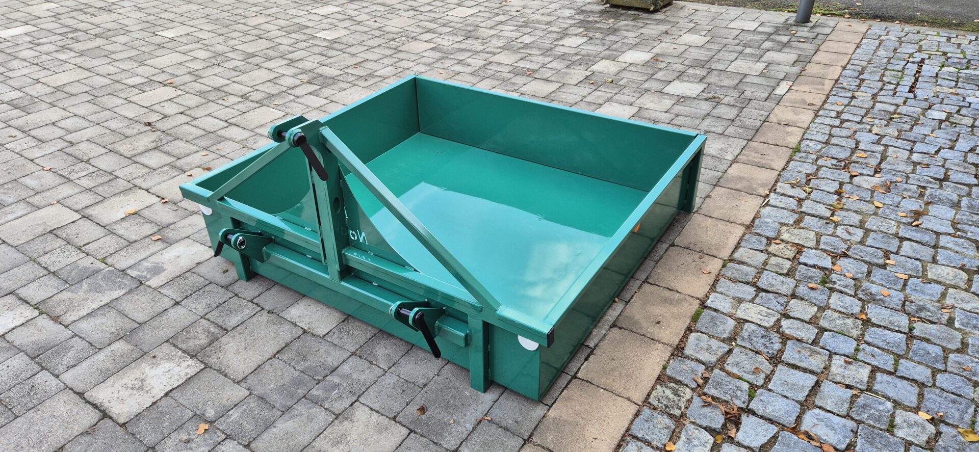 Pro traktory s tříbodovým závěsem. Pro připojení závěsem kategorie 1 nebo 2 je nutno specifikovat v objednávce. Výklopné a odnímatelné zadní čelo, nájezdová hrana pro snadné nabrání sypkých materiálů. Transportní box lakovaný kvalitní barvou. Tloušťka materiálu korby 1,5 mm vyztužený profilovaným materiálem, robustní závěs. Nosnost 500 kg.