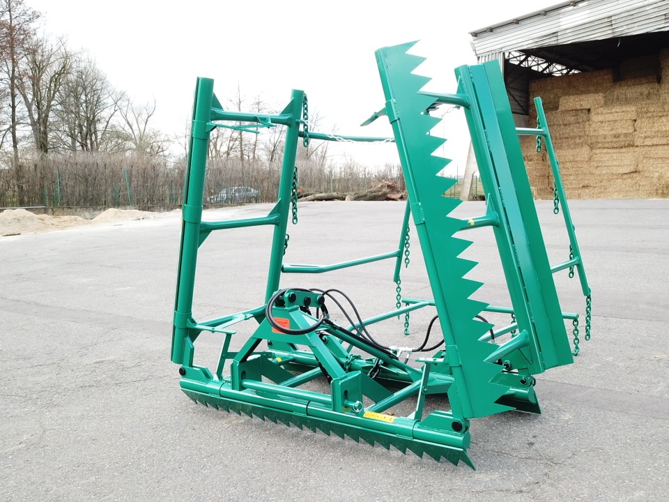 Přední břit je zubatý, stavitelný na táhlech do šesti poloh po 15 stupních. Zadní břit je hladký, přivařený v ideálním sklonu na trubkový rám smyku.