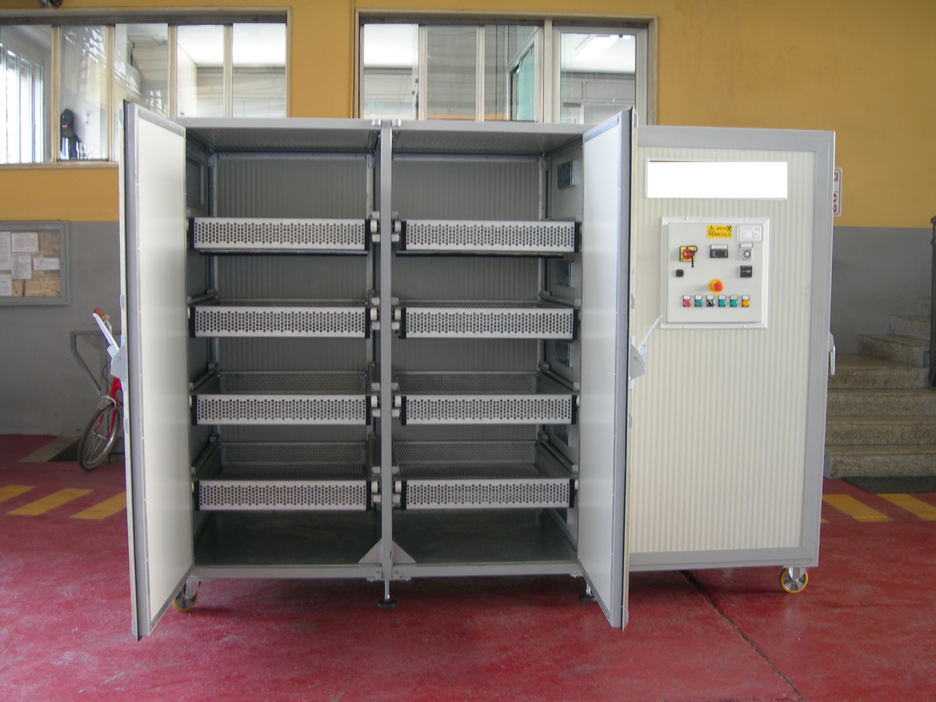 Sušení probíhá díky ohřátému vzduchu z elektrických topných těles v sušící komoře. Materiál je vložen do zásuvky nebo zásobníků (zásobníky můžou být vyrobeny z nerezového materiálu).